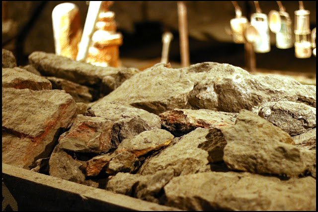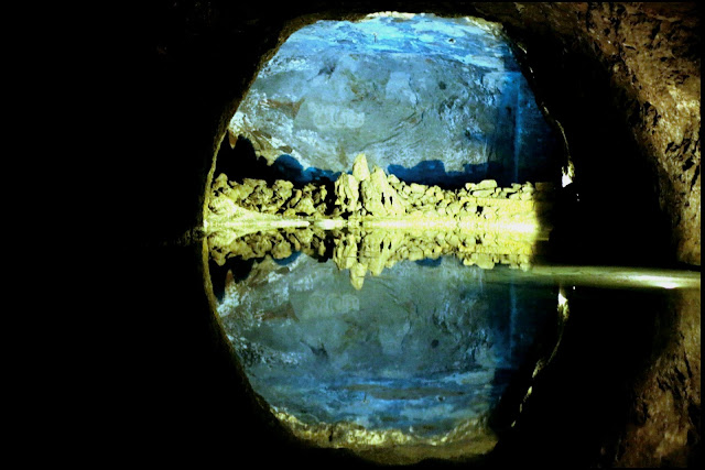 沿路上,礦洞只有昏暗的燈光。但有一、兩個位置,會有特別的燈光打起。當燈光一著,大家眼前一亮,牆上的洞出現湖水與倒影! 幸好,我帶上了大光圈的鏡頭,才能在剎那間拍下令人讚嘆的的景象。燈光一滅,眼前又是黑漆漆的一片。